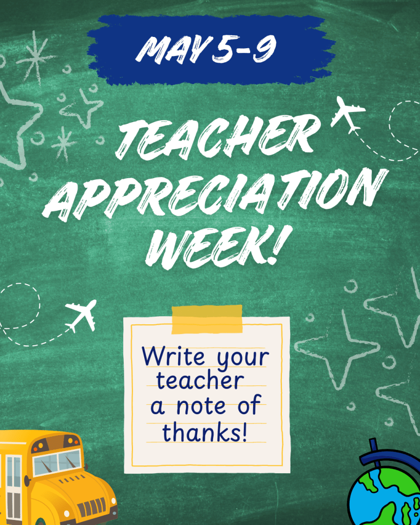 Teacher Appreciation Week is May 5-9! We love our teachers, and it’s important to tell them how much we appreciate their hard work and dedication! During Teacher Appreciation Week, you or your child(ren) can write a note or send a small gift to say thanks. Our words are powerful, and words of affirmation can change someone’s day! Let’s appreciate our teachers together!
